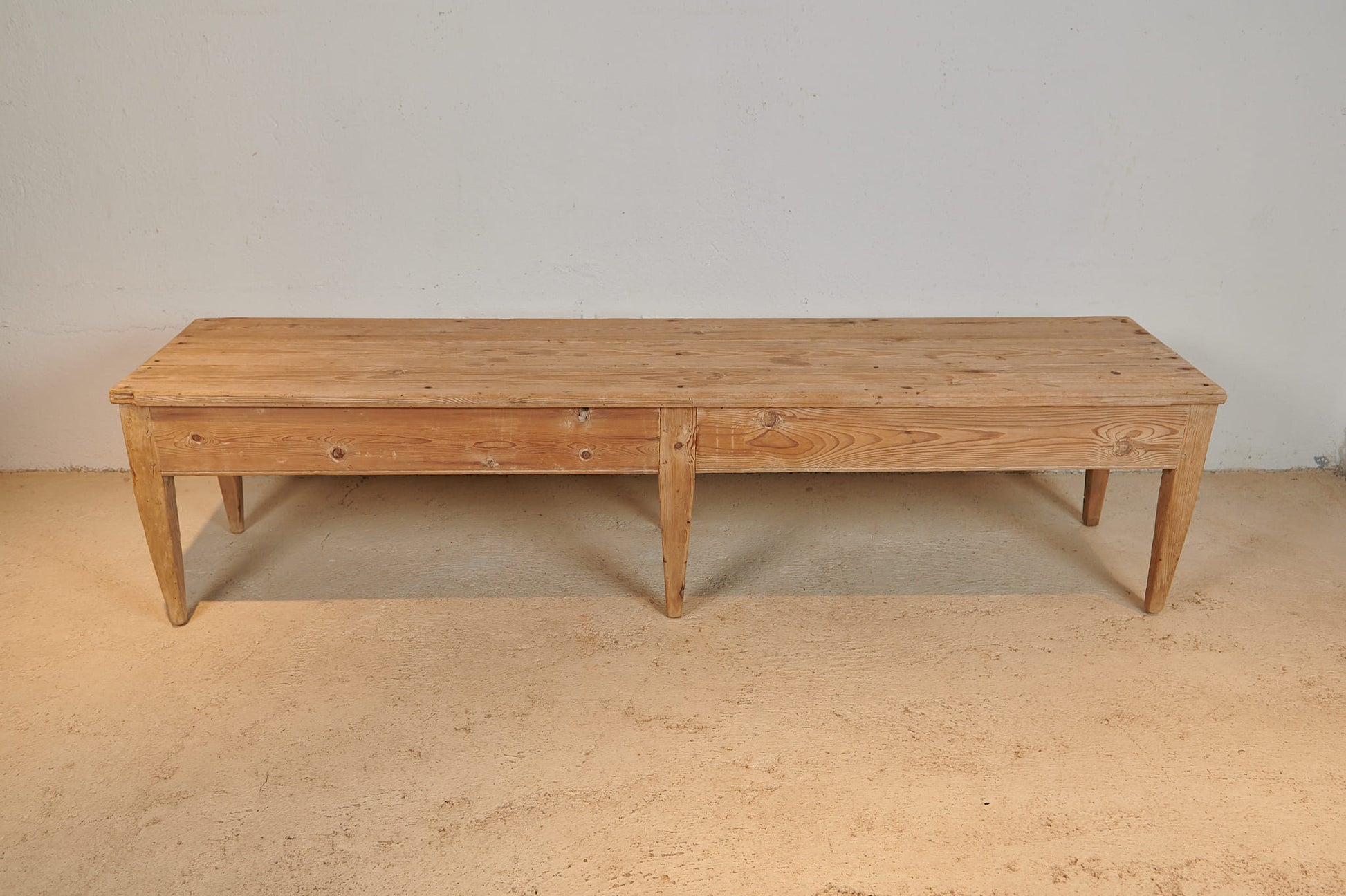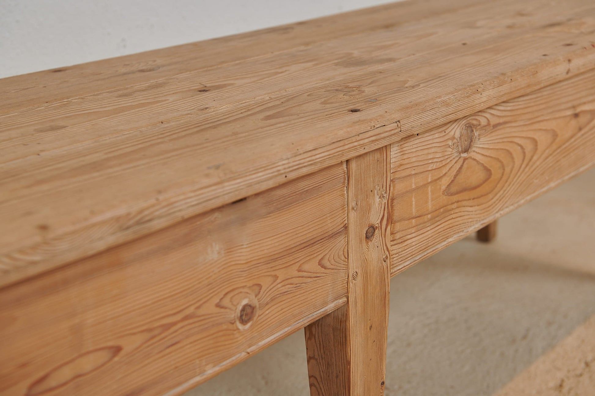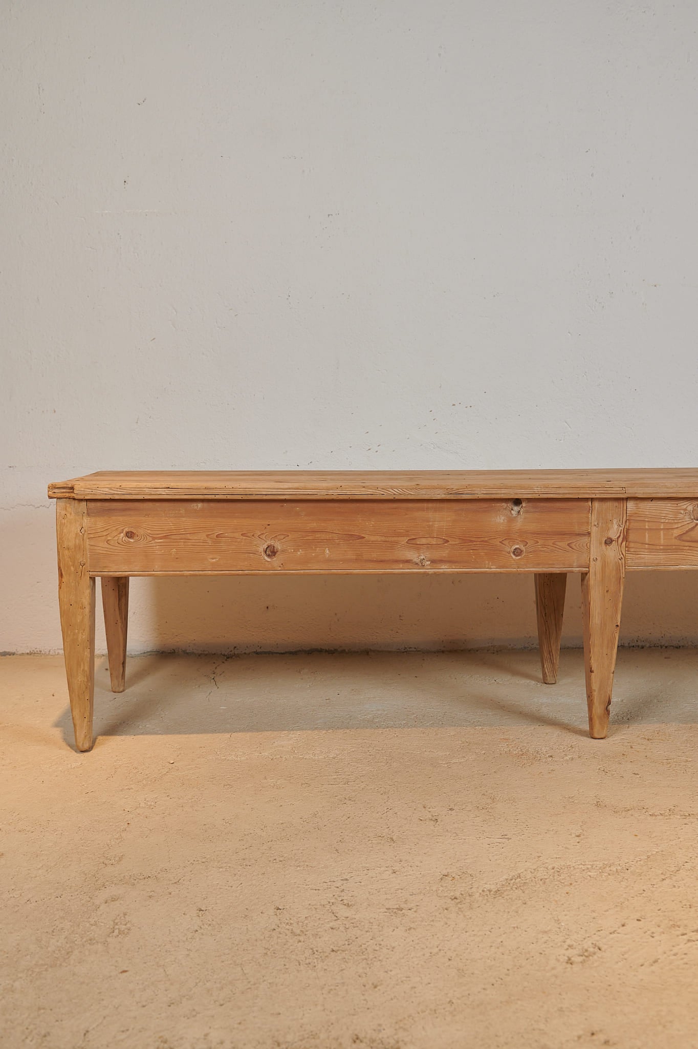 Banco de gran formato realizado en madera maciza, de líneas sencillas y proporciones equilibradas. La pieza presenta una estructura robusta, con tablero grueso y patas ligeramente afinadas que le aportan estabilidad sin perder ligereza visual.