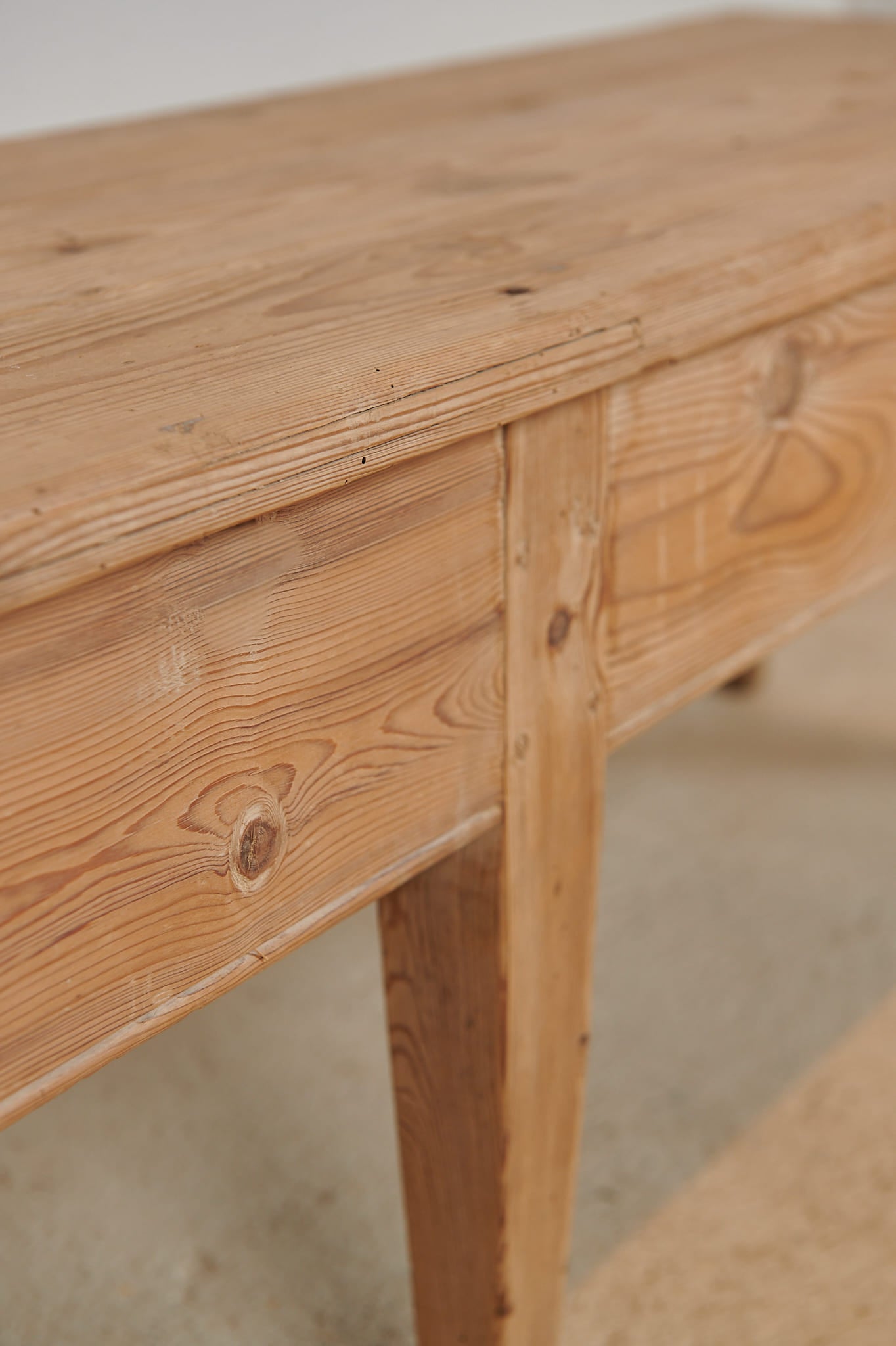 La madera muestra una pátina natural muy atractiva, con veta marcada, nudos visibles y pequeñas irregularidades propias del uso y del paso del tiempo. Estos detalles refuerzan su carácter auténtico y lo alejan de cualquier producción contemporánea industrial.