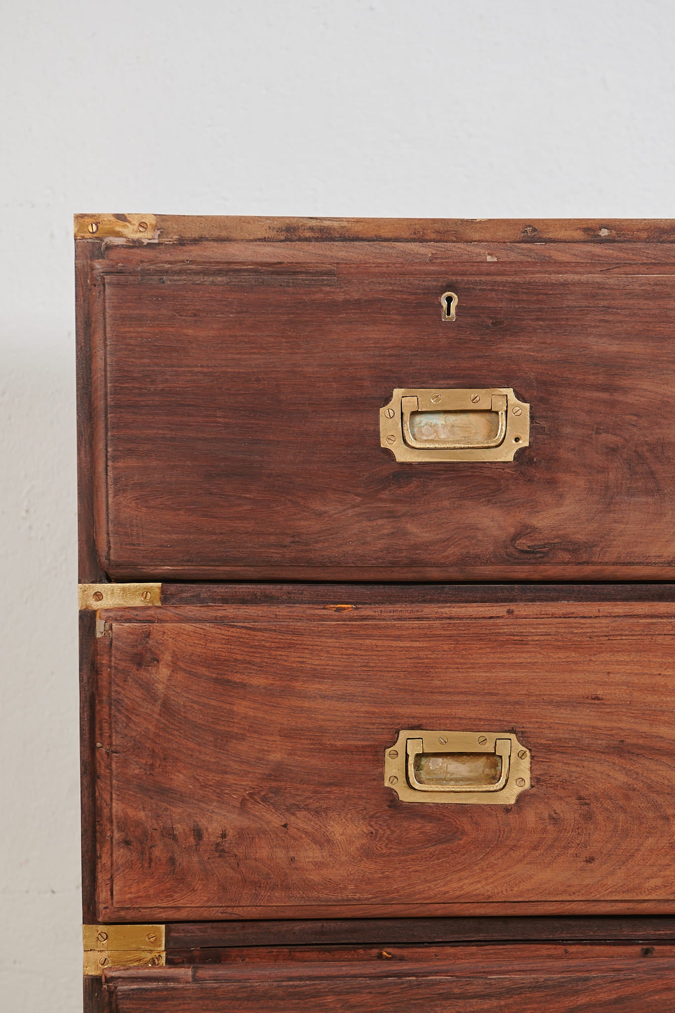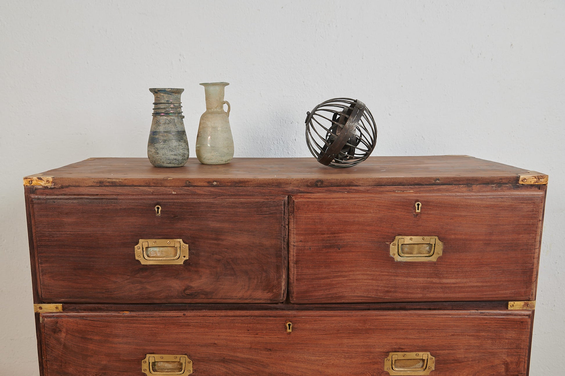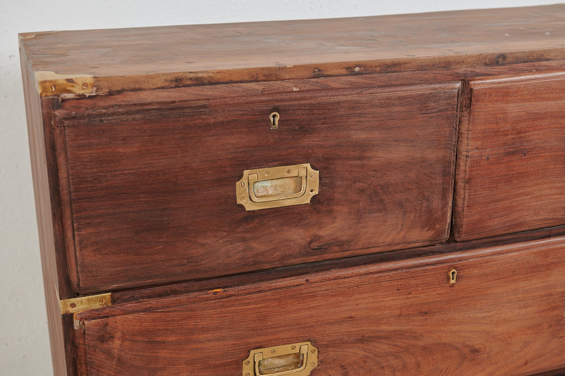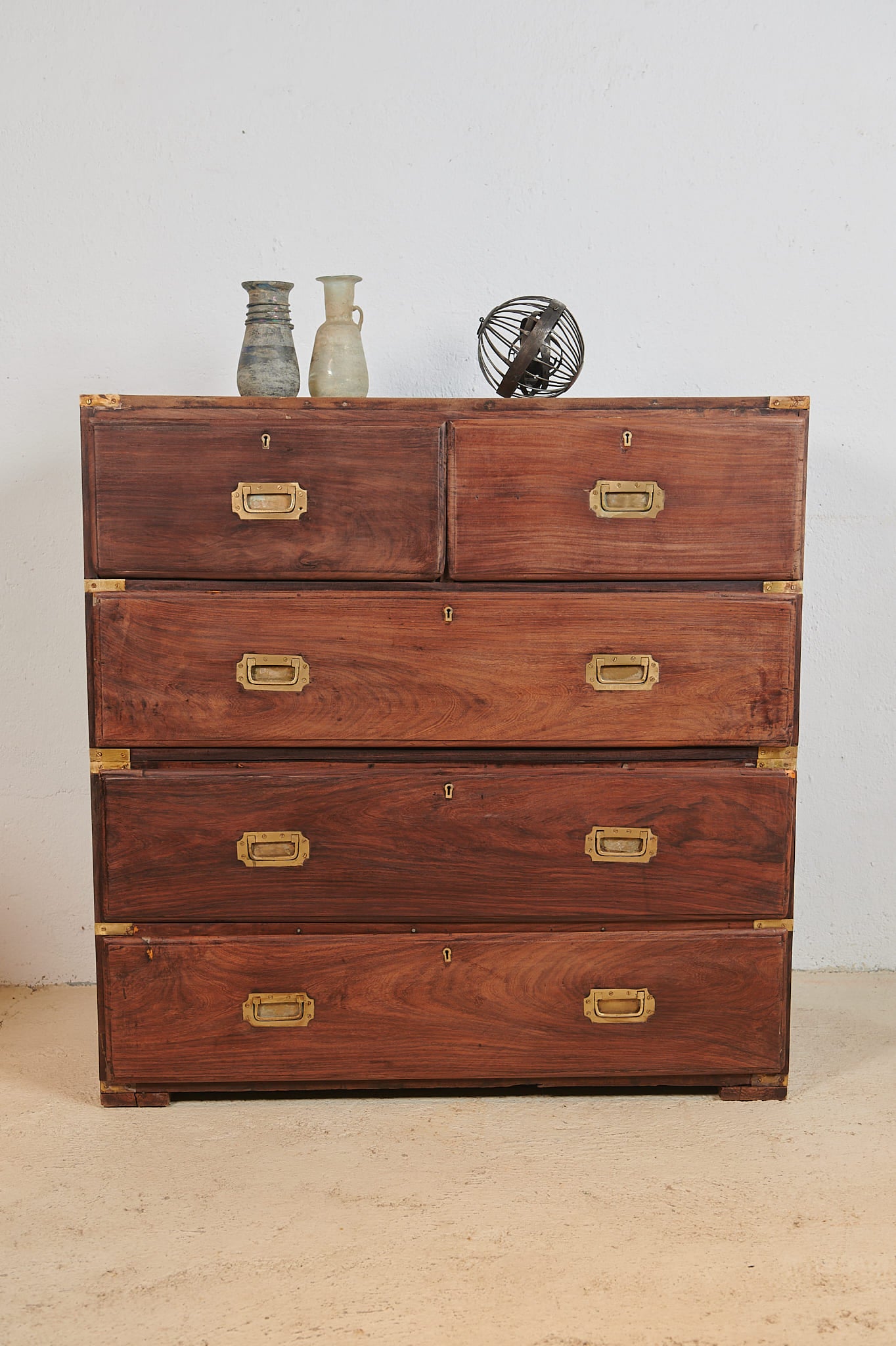 La pieza se organiza en cinco cajones, con dos superiores de menor tamaño y tres inferiores de gran capacidad, todos ellos reforzados con herrajes de latón empotrados y cantoneras metálicas, diseñadas para proteger el mueble durante el movimiento en travesía. Los tiradores rectangulares metálicos aportan un marcado carácter industrial y auténtico.