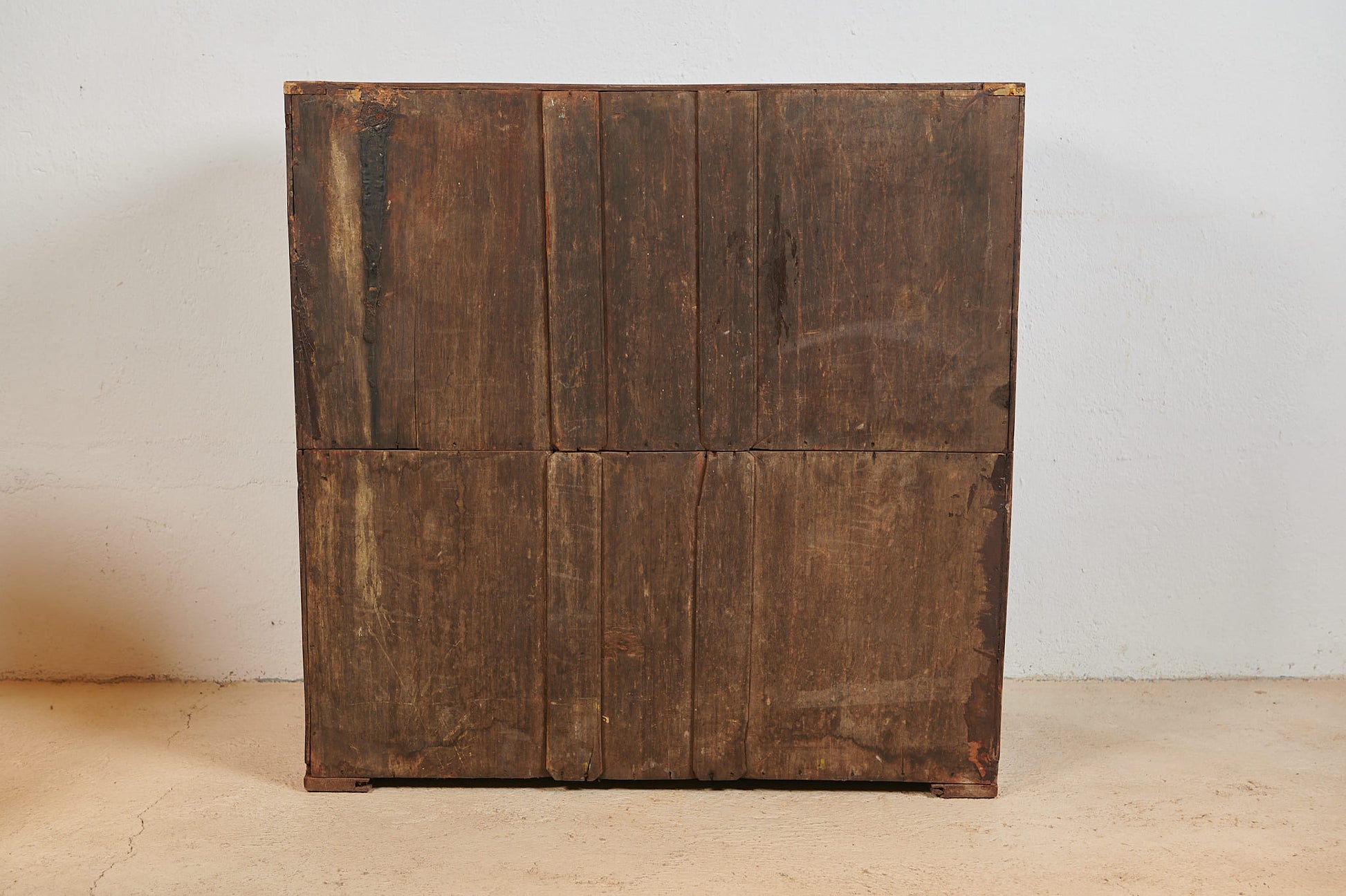 La madera presenta una pátina profunda y natural, con una veta muy marcada y un tono cálido que habla del paso del tiempo y del uso original de la pieza. Conserva cierres y detalles originales, lo que refuerza su valor decorativo y su personalidad única.
