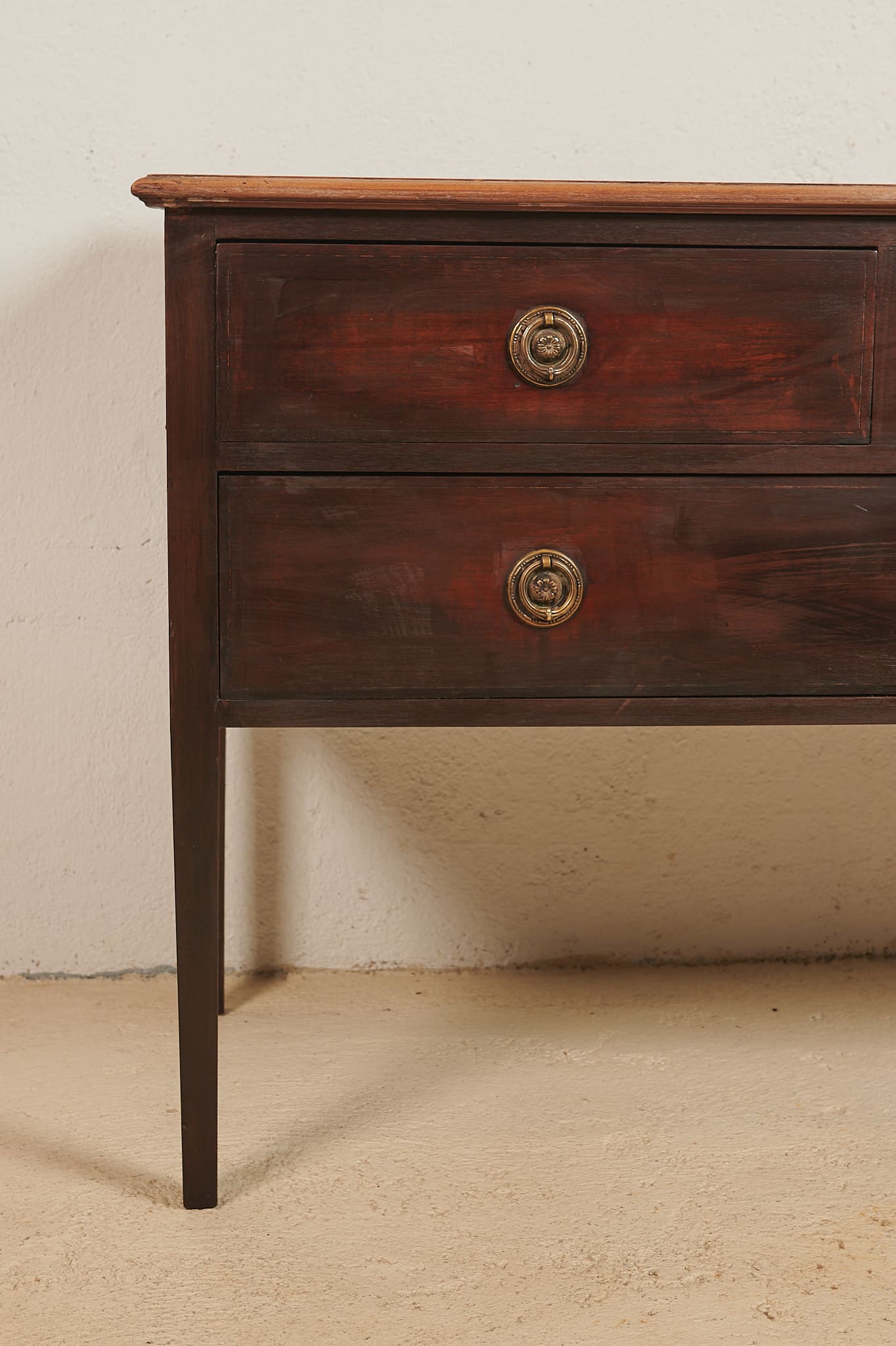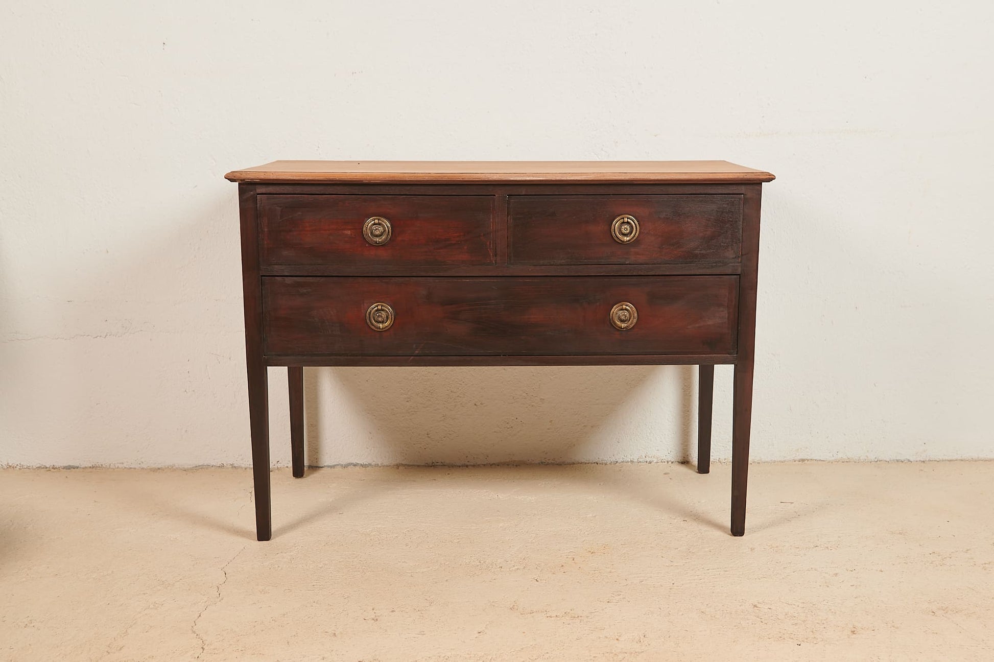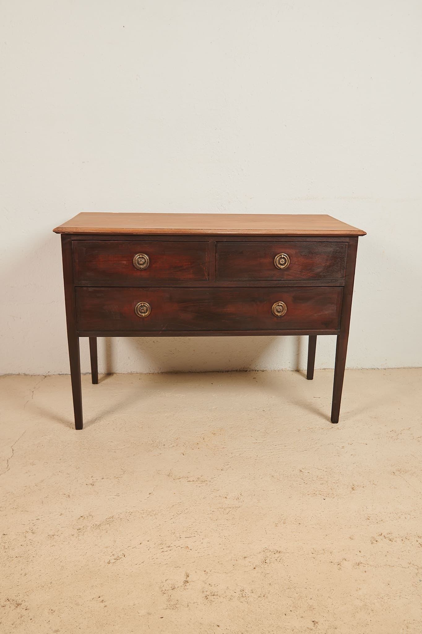Bonita cómoda de principios del siglo XX realizada en madera de caoba oscura. Consta de tres cajones —dos superiores más pequeños y uno inferior amplio— y conserva sus tiradores metálicos originales de anilla. Su estructura es ligera, de líneas rectas y patas altas, lo que le aporta una presencia elegante sin recargar el espacio. La madera mantiene su pátina original, con el encanto del paso del tiempo.