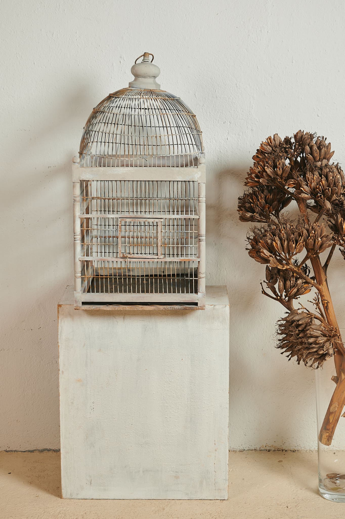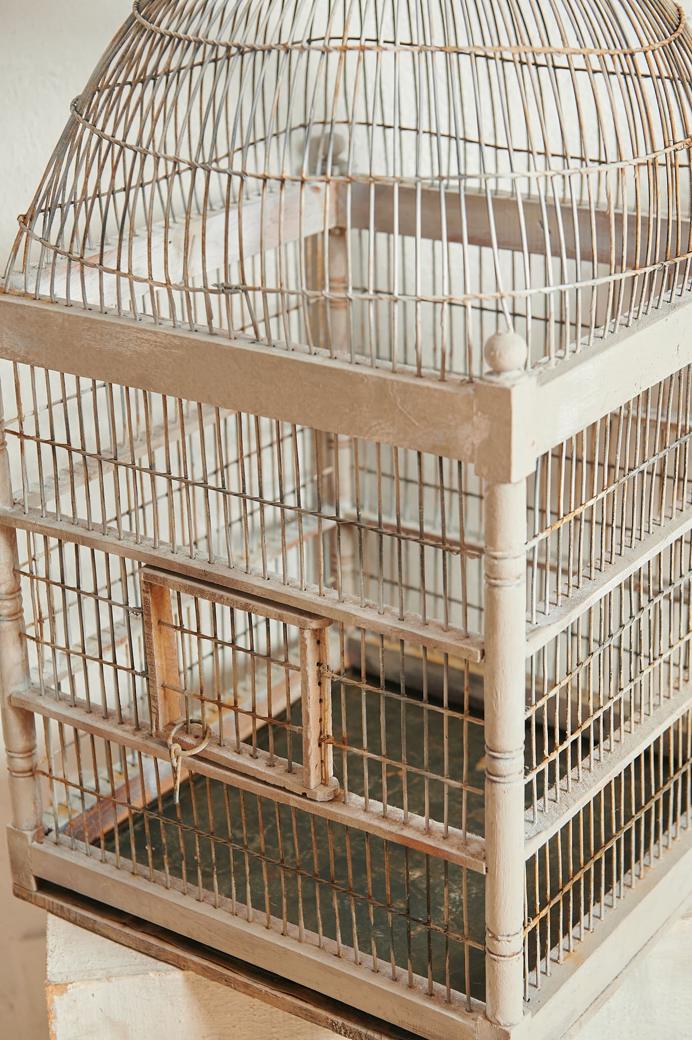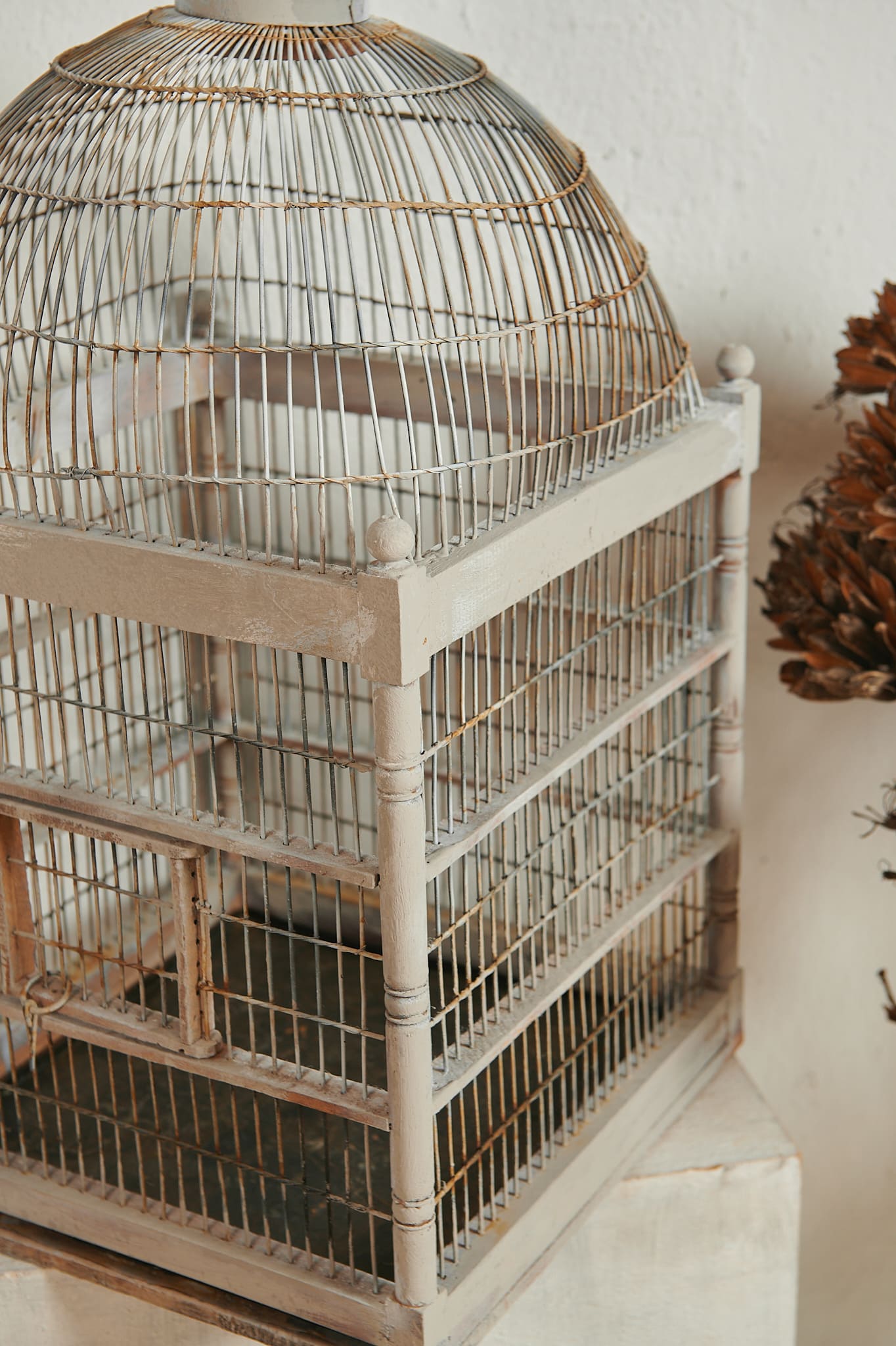 Jaula decorativa con estructura de madera pintada en blanco envejecido y cúpula superior de varillas metálicas. Su diseño combina líneas rectas con una parte superior abovedada típico de las jaulas clásicas de principios del siglo XX. El acabado desgastado y los pequeños detalles artesanales le aportan un encanto.