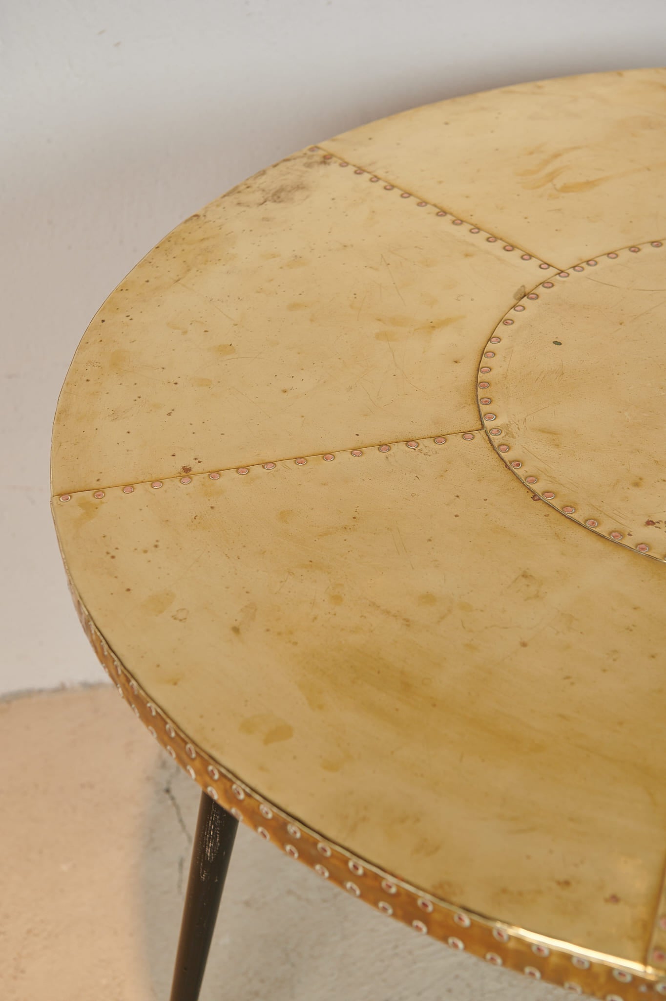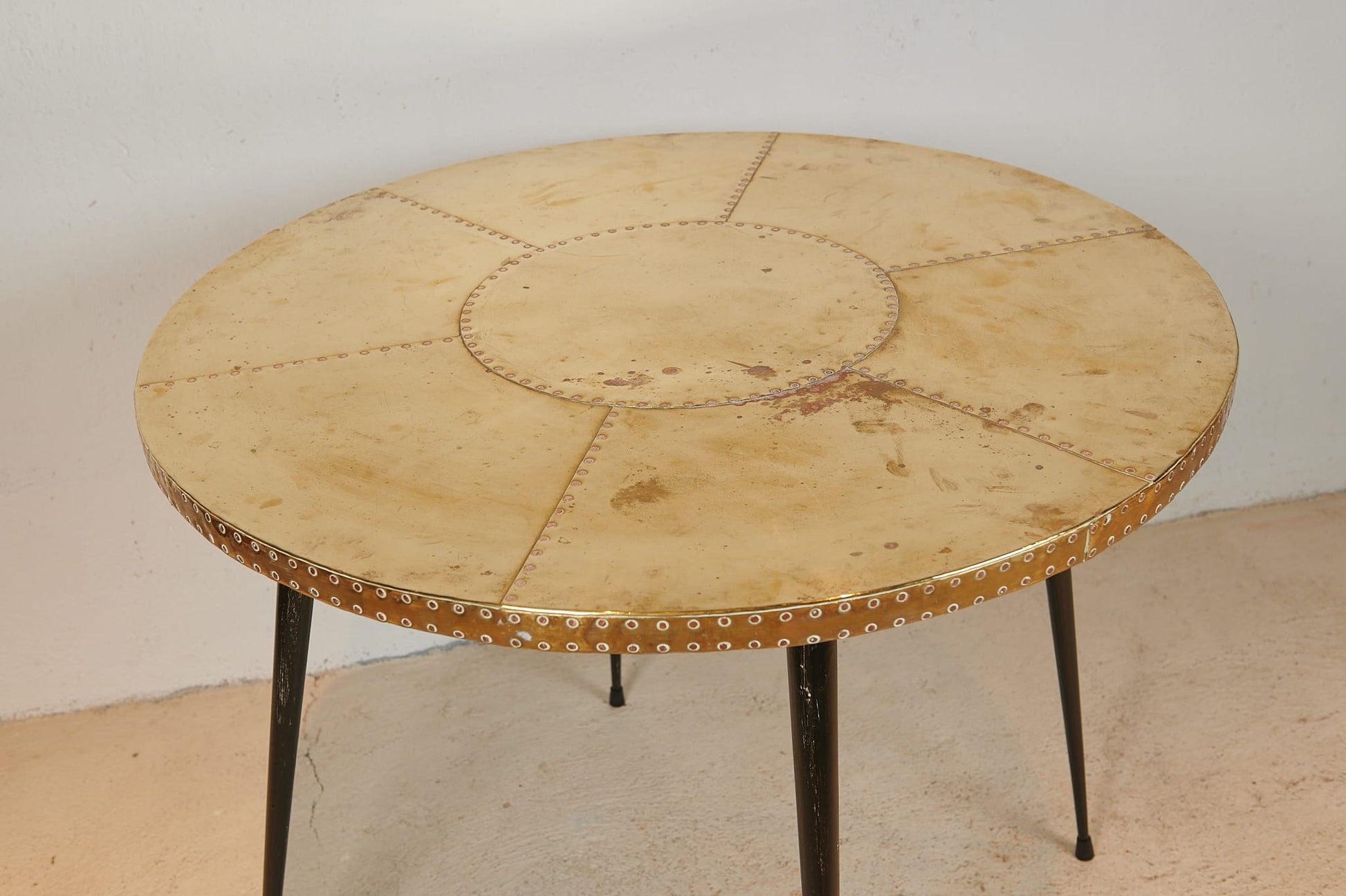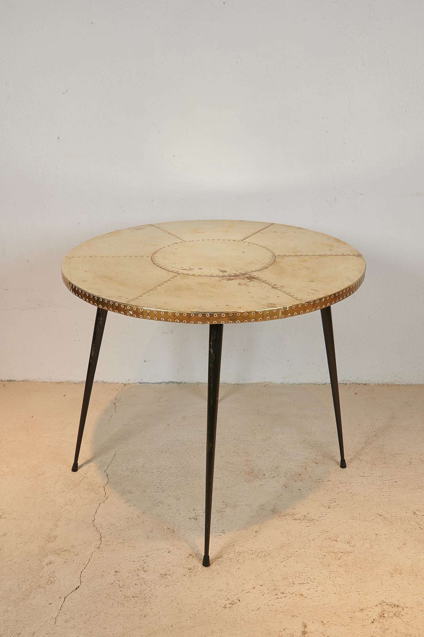 Mesa italiana de formato circular, realizada en los años 60, con sobre de latón trabajado remachado que crea un atractivo dibujo geométrico y aportan profundidad visual a la superficie. El latón presenta una pátina natural, con ligeras marcas y variaciones de tono propias del uso y del paso del tiempo, que refuerzan su carácter auténtico.