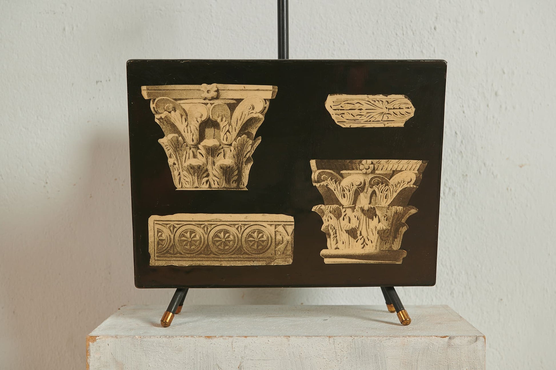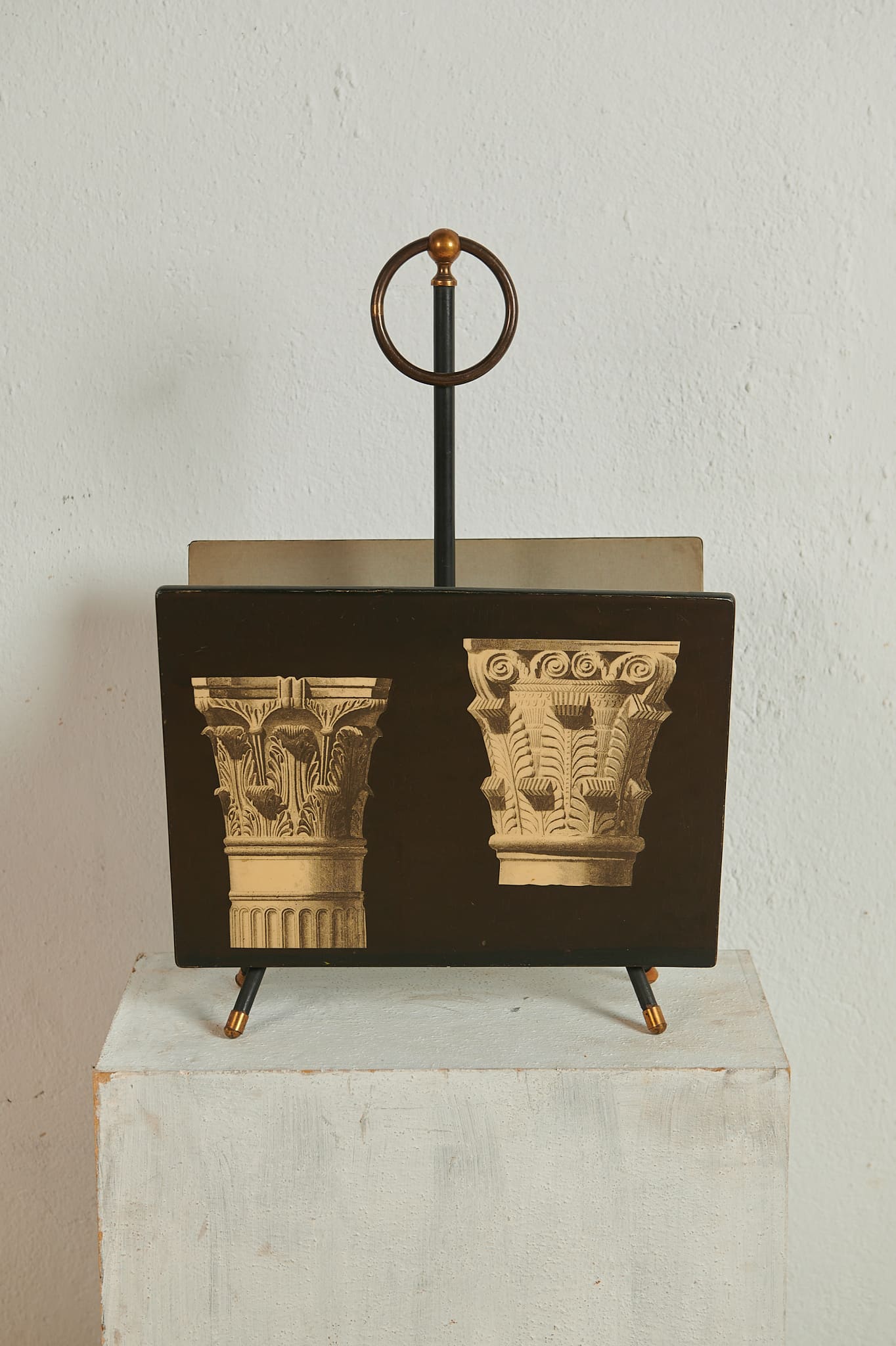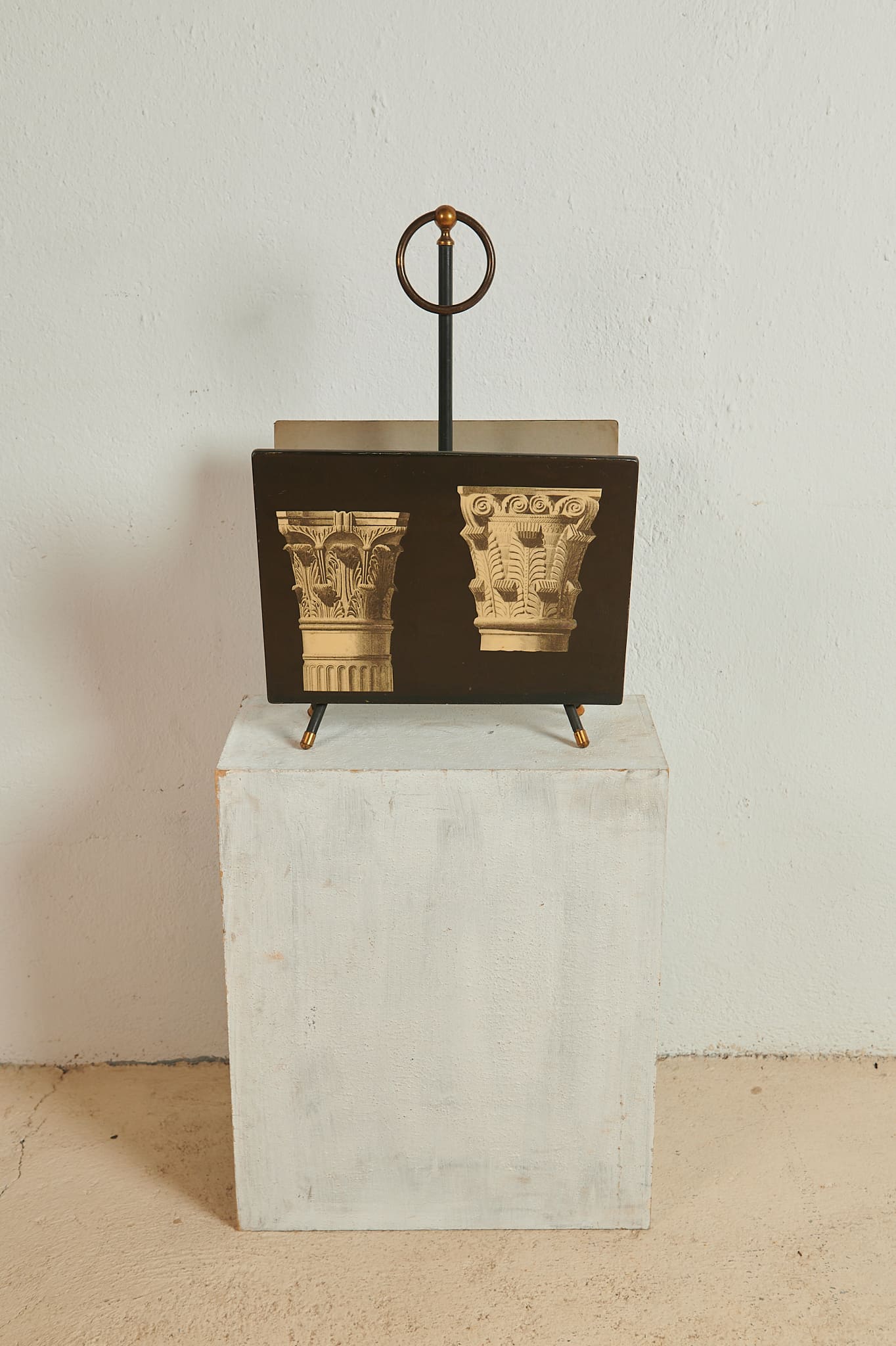 Revistero metálico con estructura en hierro lacado negro y detalles en latón dorado. Presenta un panel frontal decorado con dos ilustraciones de capiteles clásicos —de estilo corintio y compuesto— impresas en tonos sepia sobre fondo oscuro. La pieza combina funcionalidad y estética, evocando el gusto académico por la arquitectura clásica. Procedencia: España, mediados del siglo XX