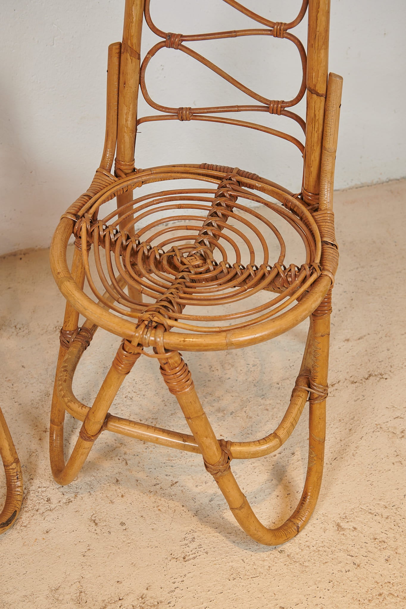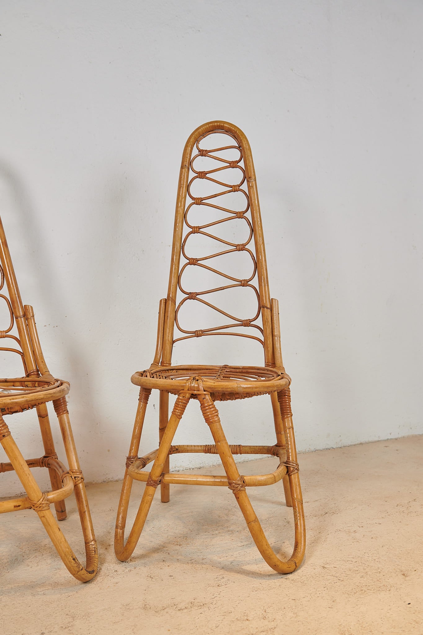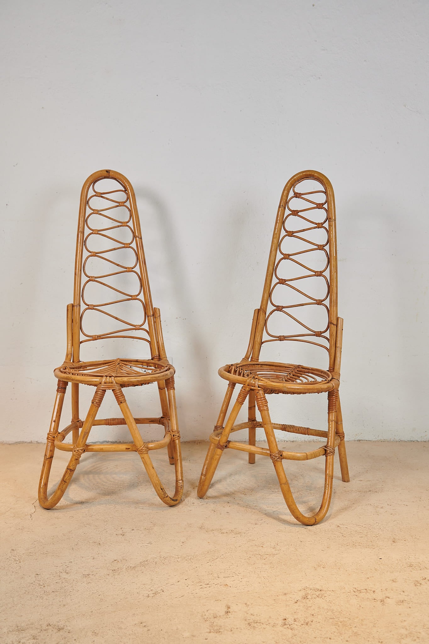 Pareja de sillas Riviera realizadas en fibras naturales, con una estructura ligera y un diseño muy decorativo de respaldo alto. El trabajo de varillas curvas y entrelazadas crea un dibujo rítmico y elegante, característico de este tipo de sillas de inspiración mediterránea.